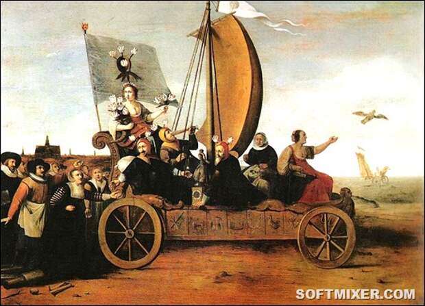 «Колесница Флоры». Аллегорическая картина Гендрика Пота, около 1640 года — лубочный сюжет, высмеивающий простаков-спекулянтов. Повозка с богиней цветов и её праздными спутниками катится под уклон в пучины моря. За ней бредут ремесленники, забросившие орудия своего труда в погоне за лёгкими деньгами.