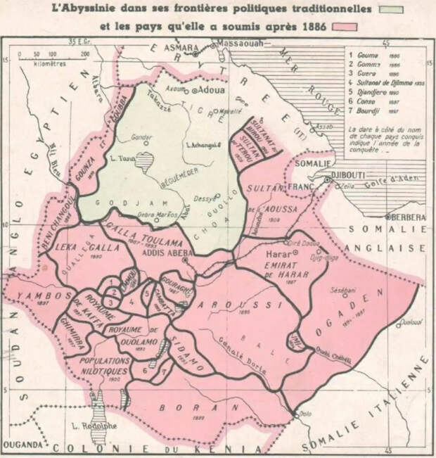 Карта территориального расширения Эфиопии с 1886 года. Присоединению части областей Эфиопия обязана русским добровольцам