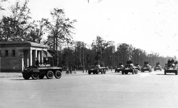 Колонна из 16-ти американских легких бронеавтомобилей М8 «Грейхаунд» (Greyhound) из состава 16-й мотомеханизированной кавалерийской группы проходит по Шарлоттенбургскому шоссе