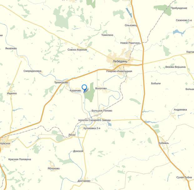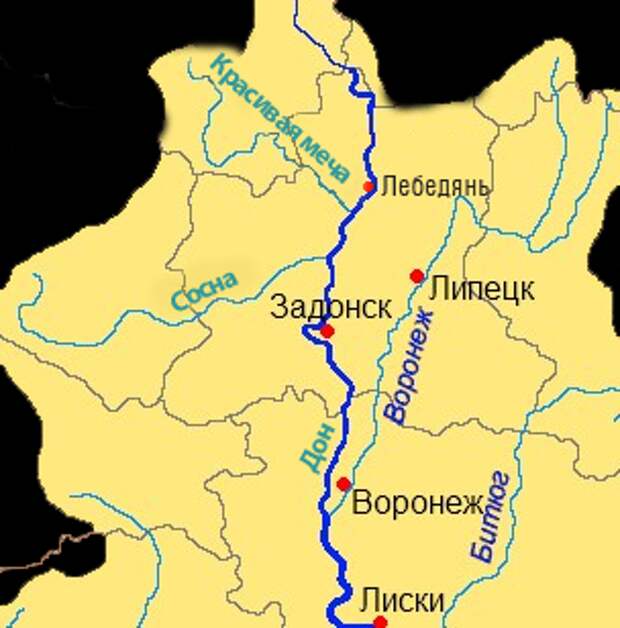 Давайте перенесём ставку Мамая на берег Дона ниже реки Красивая меча, где мы видим город Лебедянь, южнее речки Сосна. От Задонска происходит «Задонщина» и «Лебедя Непрядвы».