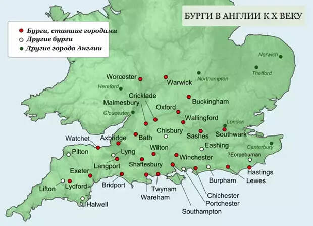 А началось бурговое строительство с восстановления оборонительных сооружений, оставшихся еще от старых римских укреплений. За все время правления Альфреда на территории Британии было построено более тридцати бургов, находящихся на расстоянии не более чем в 32 километрах друг от друга (дневной переход), и в случае надобности гарнизоны, расположенные в бургах, могли оказывать друг другу помощь и слаженно действовать с мобильными войсками. К тому же, в случае нападений викингов, эти хорошо укрепленные города-бурги давали убежища англосаксонскому сельскому населению, которое жило в радиусе 24 километров от каждого укрепленного города.