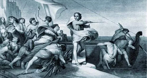 Молодой «король» Альфред подстрекает англосаксов к отражению вторжения датчан. Гравюра Х. Борна по мотивам Г. Ф. Уоттса. Из книги «Иллюстрации английской и шотландской истории»