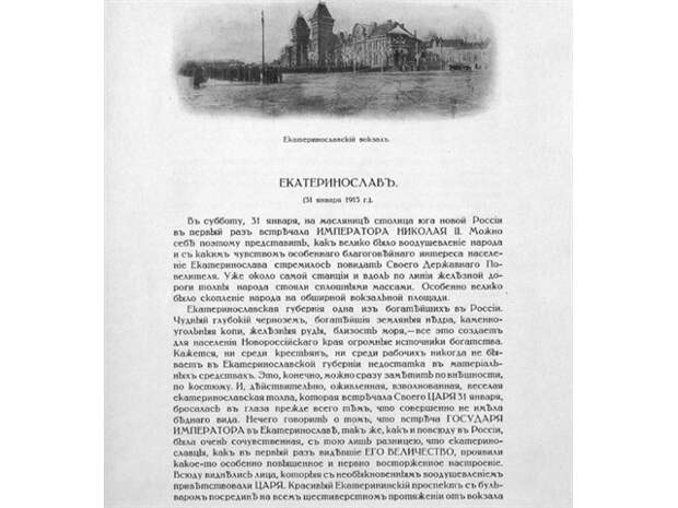 «В субботу, 31 января, на масленице столица юга новой России в первый раз встречала императора Николая II. Можно себе поэтому представить, как велико было воодушевление народа и с каким чувством особенного благоговейного интереса население Екатеринослава стремилось повидать своего державного повелителя.