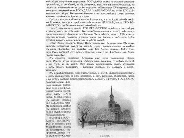 В соборе государь император принял от духовенства икону св. Екатерины, Покровительницы города, и икону Самарской [конец стр. 51] Божией Матери, особо чтимой в крае, и двадцать пять тысяч рублей на нужды войны.